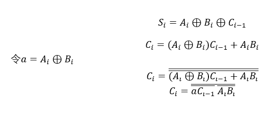 经过上面的介绍我相信大家对加法器已经有了一定了解,接下来我们为大家介绍如何用与非门等设计一个全加法器。首先我们需要对 公式化简 ,这里就用到了前面介绍的逻辑转换律。