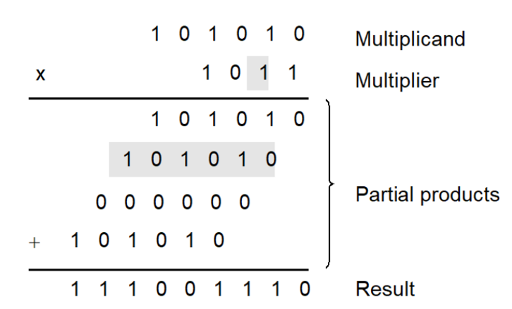 实现乘法的比较常用的方法是类似与手工计算乘法的方式: