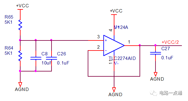 在运放的实际使用,我们一般为了保持运放的频率特性,一般都采用双电源供电,但有的时候在实际使用,我们只有单电源的情况,也能实现运放的正常工作。 首先我们运用运放跟随电路,实现一个VCC/2的分压: