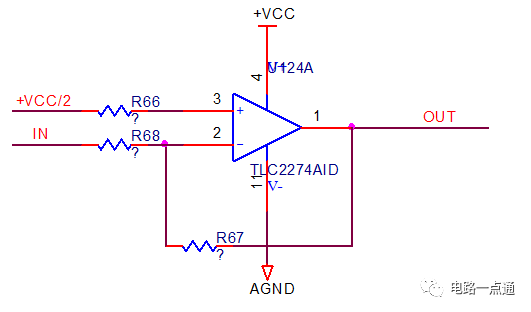 分压电路当然,如果在要求不是很高的场合,我们可以直接电阻分压,获得+VCC/2,但由于电阻分压的特性所在,其动态的响应速度会非常慢,请谨慎使用。 获得+VCC/2后,我们可以用单电源实现信号放大功能,如下图: