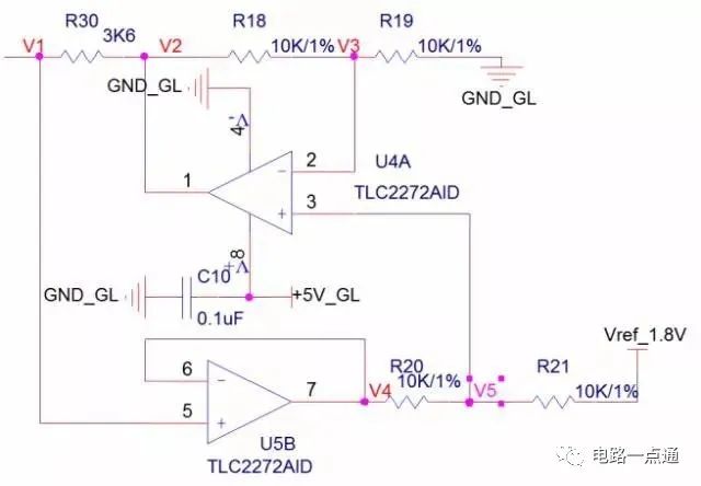 U5B(上图中下边的运放)为电压跟随器,故V1=V4;