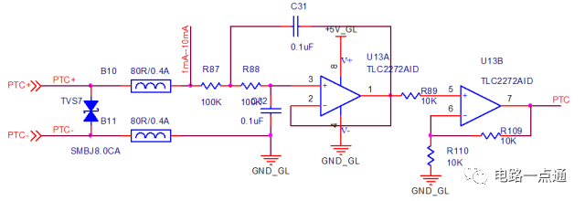 该电路应用时,要注意在输入端施加保护,可以并TVS,但要注意节电容对测量精度的影响,当然,如果在一些低成本场合,上述电路图可简化为下电路。
