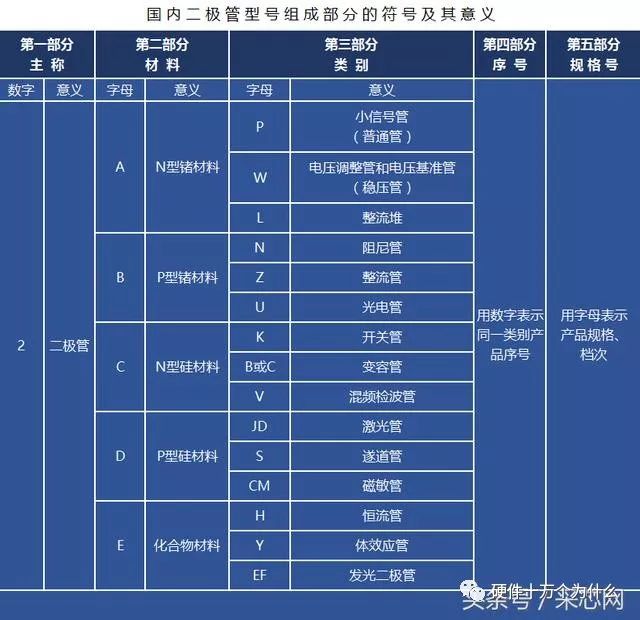 (1)按照国产半导体器件型号命名方法:二极管的型号命名由五个部分组成:主称、材料与极性、类别、序号和规格号(同一类产品的档次)。