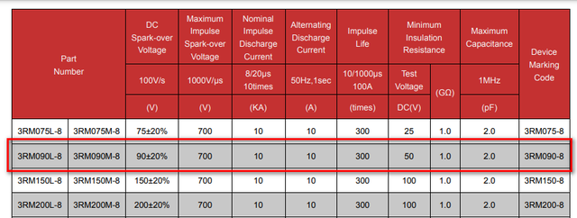 结合RS422的传输电性能以及设备耐压因素等特点,最终选择GDT型号为3RM090L-8。