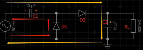 电源负半周时,二极管D1导通,D2截止,电流从电源下端流出经过D1, C1回到电源,因此电容C1右正左负,如下图中红色箭头。电源正半周时,电容C1上的电压叠加电源电压,使二极管D2导通,二极管D1截止,电容C2上正下负,峰值电压可达2倍电源的峰值电压,即实现二倍压。