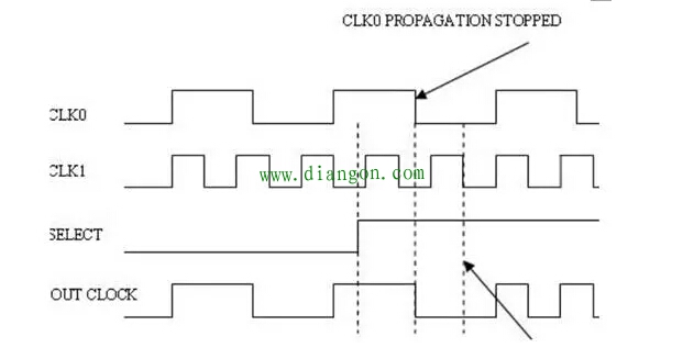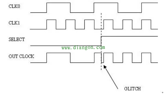 如上图,大家会很自然而想到的一种时钟切换电路,可是,你仔细分析,你会发现该电路会出现如下的问题,毛刺!这个毛刺无论对于clk0还是clk1都不是好事,它不属于任何一个时钟域,它的脉宽根本无法确定,你切换的点会影响毛刺的宽度。