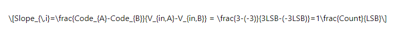 在此等式中,使用输出代码的十进制等效值。另外,请注意代码的标志。正如预期的那样,理想的坡度是一个。测量的斜率可以通过类似的方式找到: