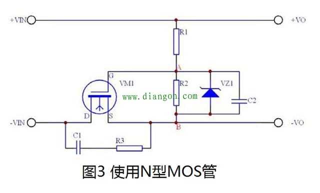 N沟道MOS管通过S管脚和D管脚串接于电源和负载之间,电阻R1为MOS管提供电压偏置,利用MOS管的开关特性控制电路的导通和断开,从而防止电源反接给负载带来损坏。正接时候,R1提供VGS电压,MOS饱和导通。反接的时候MOS不能导通,所以起到防反接作用。功率MOS管的Rds(on)只有20mΩ实际损耗很小,3A的电流,功耗为(3×3)×0.02=0.18W根本不用外加散热片。解决了现有采用二极管电源防反接方案存在的压降和功耗过大的问题。VZ1为稳压管防止栅源电压过高击穿mos管。
