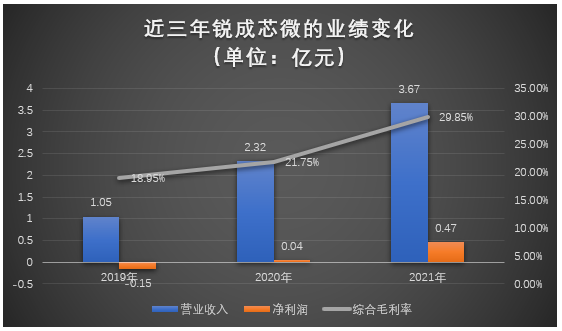 招股书显示,2019年-2021年锐成芯微实现营业收入分别是1.05亿元、2.32亿元、3.67亿元,同期实现的净利润分别为-0.15亿元、0.04亿元、0.47亿元;主营业务毛利率分别为18.95%、21.75%、29.85%。