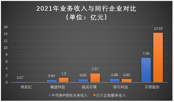 2021年锐成芯微半导体IP授权、芯片定制服务业务分别实现的收入为0.82亿元、2.57亿元。在半导体IP授权收入方面,锐成芯微高于