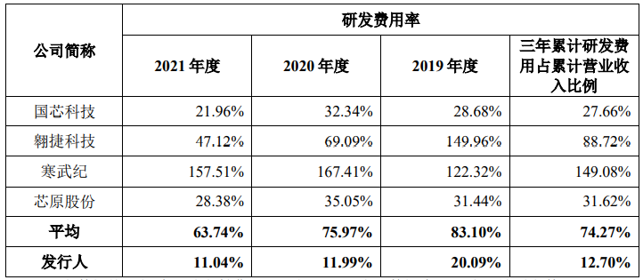 在研发方面,2019年-2021年锐成芯微分别投入0.23亿元、0.30亿元、0.46亿元,分别占当期总营收的比例为21.57%、12.77%、12.41%。2021年研发投入同比增长53.33%,近三年研发费用均高于销售费用和管理费用。
