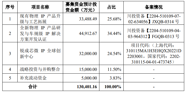 此次上市拟募集13.04亿元资金,投建“现有物理IP产品升级与工艺拓展”、“全球物理IP产品研发与车规级IP解决方案开发认证”、“锐成芯微IP全球创新