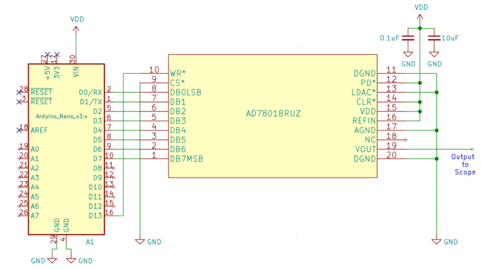 为了尝试这种技术,我将 Analog Devices 的AD7801(一个 8 位 DAC)连接到我正在研究的Arduino Nano设计中。Nano 的核心是 Microchip ATmega328,它没有板载 DAC。AD7801 使用 8 条数据线的并行输入,这些数据线由另一条线同步输入,写入速度非常快。需要注意的是,我们可以使用此设置查看 8 位数据,但 10 位、12 位或其他大小可以与其他 DAC 一起使用,或者可以缩放以适应 8 位 DAC。我将 8 条数据线连接到 Arduino 上的端口 DAC,并将 WR 线连接到 Arduino 的 D13,如图 1 所示。