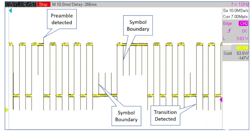 信号迹线内上下的“尖峰”是指示代码确定符号边界的位置的标记。在正确的时间对符号进行切片非常重要,当出现长时间的 0 或 1 时,这一点变得至关重要。这是因为没有发现从 0 到 1 或 1 到 0 的转换。在示波器上查看这些“尖峰”非常有用,因为它可以让我们验证实际时序并确认没有遗漏。这些符号边界“尖峰”是通过使用以下 Arduino IDE 代码向 DAC 发送 127 来创建的,该代码插入到符号时序代码的适当位置: