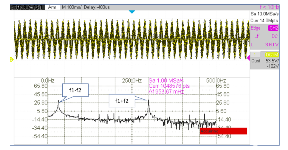 图 4示波器屏幕截图显示了频谱如何混合或倍增频率。