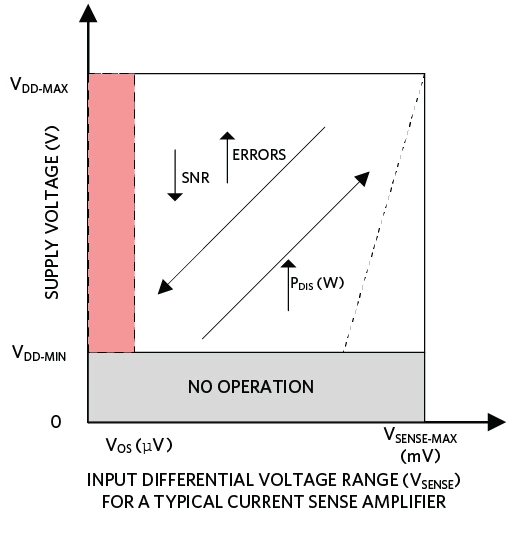 由于差分电压范围是由电流检测放大器的选择设置的,因此增加 R SENSE值可以提高较低电流值的测量精度,但在较高电流时功耗较高,这可能是不可接受的。此外,感测电流的范围减小(I MIN : I MAX)。