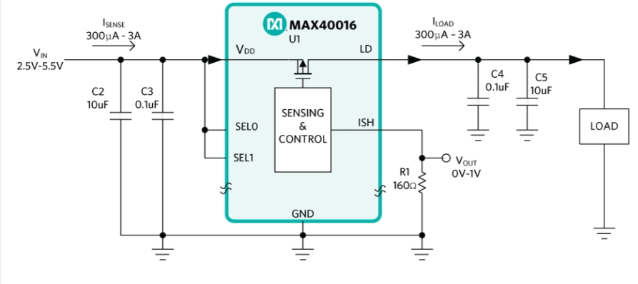 图 3:具有集成电流感应元件的 2.5V 至 5.5V 电流感应系统