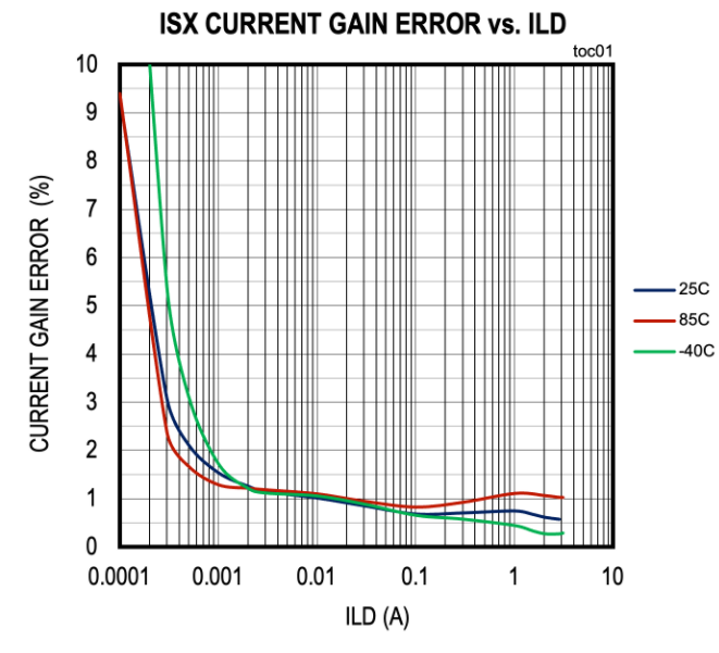 图 2:ISH 输出的增益误差与不同温度下的负载电流