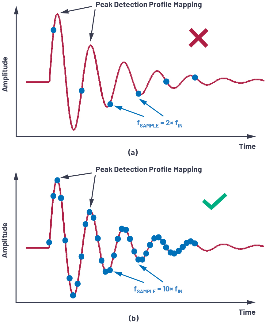 图1.瞬态信号的时域分析:(a) 奈奎斯特采样速率,(b) 过采样速率