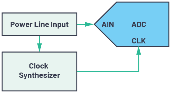 某些应用(例如相干采样)要求以良好的分辨率根据模拟输入频率调整输出采样速率。电力线监测就是这种应用的一个例子,需要相干采样来满足IEC 61000-4-30规定的A类电能质量计量要求。这些标准的精度要求决定了采样速率需要跟踪输入线路频率漂移。在这些应用中,电力线上的时钟频率合成器电路产生ADC的输出数字数据采样时钟,如图2所示。