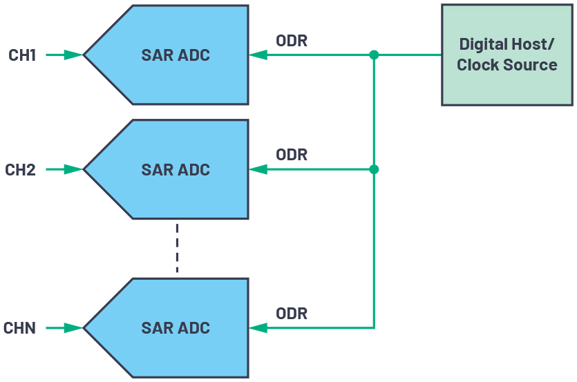 在奈奎斯特速率转换器中,ADC核心的采样频率是模拟输入带宽fin的两倍。此类别下最常见的例子是奈奎斯特速率SAR ADC,其输入和输出采样速率相同。因此,数字输出数据速率时钟ODR可以复用为ADC核心采样时钟MCLK。在SAR ADC数据手册中,数字输出数据时钟表示为CONVST或DRDY。但如前所述,本文将所有这些时钟统称为ODR时钟。ODR和MCLK组合可简化数字数据接口,如图5所示,仅需一条时钟布线。由于时钟由外部时钟源或外部数字主机提供并控制,因此ADC由外部提供时钟。这意味着ADC是在外部托管模式下运行。