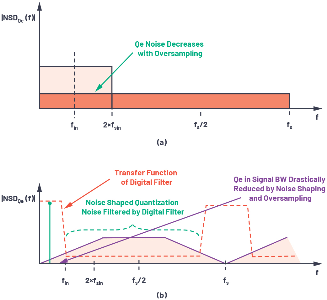 图10.(a) 过采样SAR ADC的频谱,(b) Σ-Δ型ADC的频谱