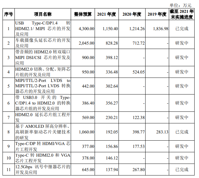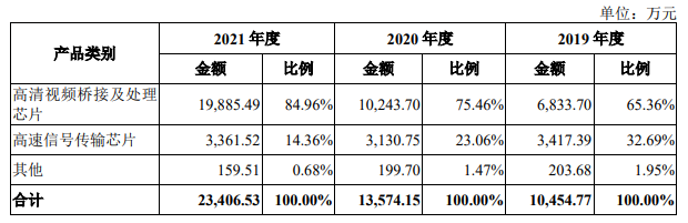 招股书显示,2019年-2021年实现的营业收入分别为1.05亿元、1.36亿元、2.34亿元,三年累计不超5亿元。对于一家成立近16年的公司,这样的营收规模是相对较小的,不过也跟高清视频桥接及处理芯片和高速信号传输芯片市场规模本身过小有关。