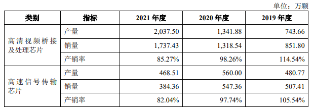 2019年-2020年龙迅半导体两款主营产品的产量均不大,2021年高速信号传输芯片产量甚至收缩至468.51万颗。不过高清视频桥接及处理芯片产量2021年有出现较大幅度的增长。