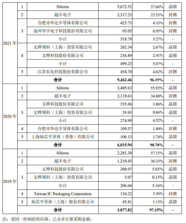 封测方面,龙迅半导体选择的是台湾竹南的IC封测大厂超丰电子,2019年-2021年封测采购额占比分别为30.33%、34.80%、23.55%,三年累计采购额达5647.31万元。2021年引入中国大陆第一大封测厂长电科技共同供应,超丰电子的采购比例有所下降。