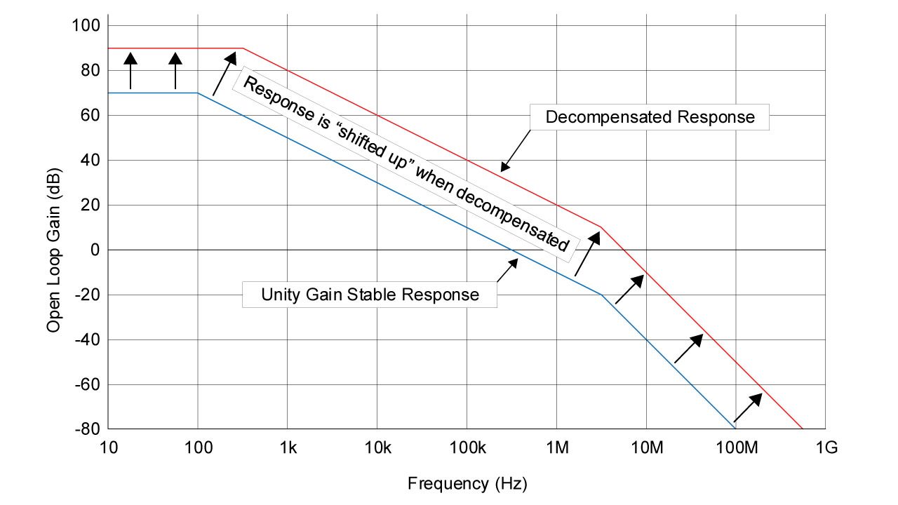“去补偿”仅仅意味着在 Aol(开环增益)响应曲线中放置了一个高于 0 dB 的第二个极点。第二个极点也决定了确保放大器稳定性所需的最小增益。想象一下 Aol 曲线“上移”,如图 1 所示。增加的 Aol 会导致更宽的带宽。