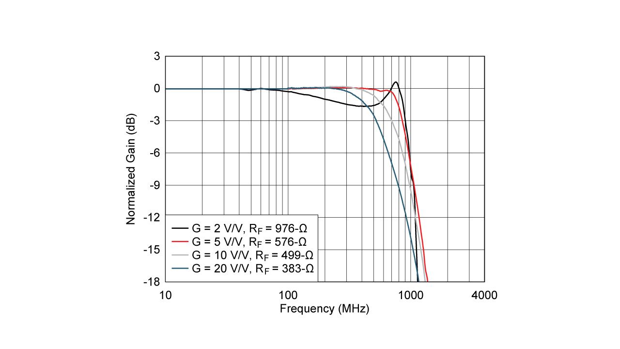 在电流反馈架构中,无论增益如何,带宽都几乎保持不变,如图 4 所示。该图出现在THS3491数据表中。