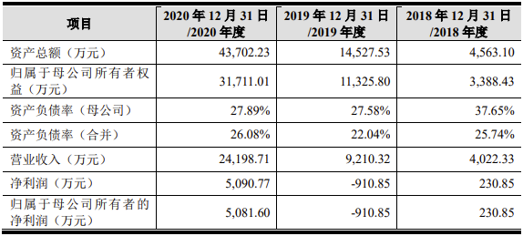 招股书显示,2018年、2019年、2020年,纳芯微分别实现营业收入4,022.33万元、9,210.32万元、2.42亿元,净利润分别为230.85万元、-910.85万元、5,090.77万元。2021年前三季度,纳芯微实现营收5.79亿元,同比增长了266.16%;同期归母净利润1.54亿元,同比增长了344.82%。