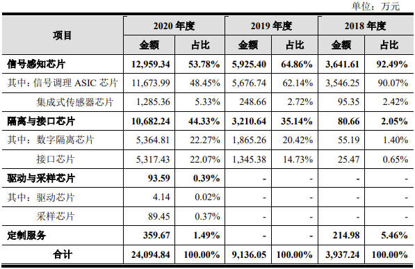 可以发现,纳芯微在不断的调整业务战略,发展新的市场增长点。纳芯微在招股书中写道,“2018年至今,公司隔离与接口芯片在信息通讯行业的增幅最大。在信号感知芯片方面,公司各类信号调理