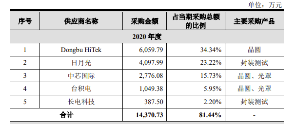 招股书显示,纳芯微对前五大供应商的采购额分别占当期采购总额的 87.85%、85.83%和 81.44%,集中度较高。采购内容涉及晶圆、晶圆中测、