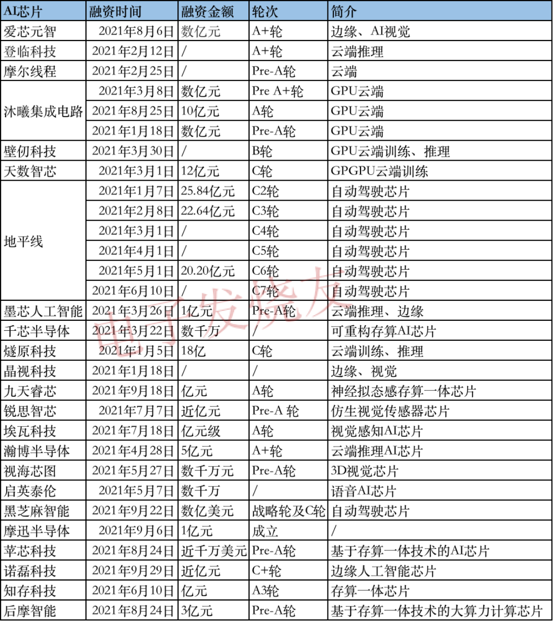 2021年AI芯片投融资:云端/边缘、内存一体、智能汽车芯片等