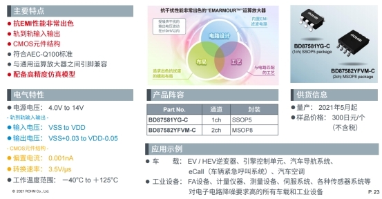 摘要:面向车载引擎控制单元和FA设备的异常检测系统等需要,在恶劣环境下进行高速感测的车载和工业设备,ROHM(罗姆)推出一款抗EMI性能非常出色的运算放大器“BD8758xYx-C”,新产品具备“EMARMOUR系列”中超高的抗干扰性能,有助于减少异常检测系统的设计工时并提高系统可靠性。
