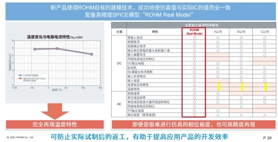 在新产品验证用的仿真模型中,利用ROHM自有的建模技术,忠实地再现了实际IC的电气特性和温度特性,成功地使仿真值与IC实物的值完全一致。ROHM提供这种高精度SPICE模型“ROHM Real Model”,通过可靠的验证,可有效防止实际试制后的返工等情况发生,有助于提高应用产品的开发效率。