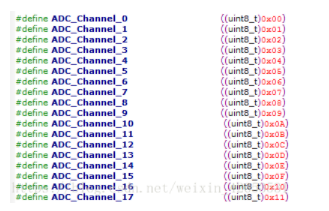 16个外部通道:简单的说就是芯片上有16个引脚是可以接到模拟电压上进行电压值检测的。16个通道不是独立的分配给3个转换器(ADC1、ADC2、ADC3)使用,有些通道是被多个转换器共用的。首先看看16个通道在固件库的宏定义(写代码要看的):