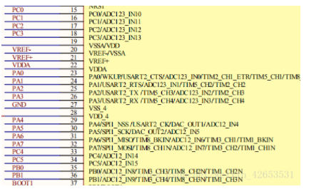 ADC123_IN10:字母“ADC”不用多说,“123”代表它被3个(ADC1、ADC2、ADC3)转换器共用的引脚,“10”对应刚才那张宏定义图里面的ADC_Channel_10,这样就能找到每个通道对应的引脚了。