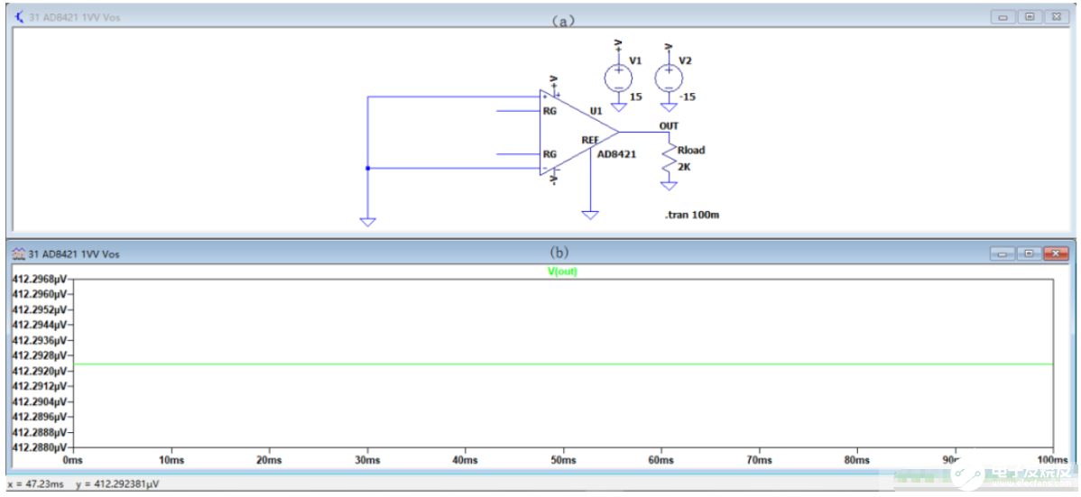 如图3.11(a),使用LTspice设计AD8421在增益为1倍,供电电源为±15V。如图3.11(b),输出总失调电压的瞬态分析结果为412.292μV,等同于理论计算值。