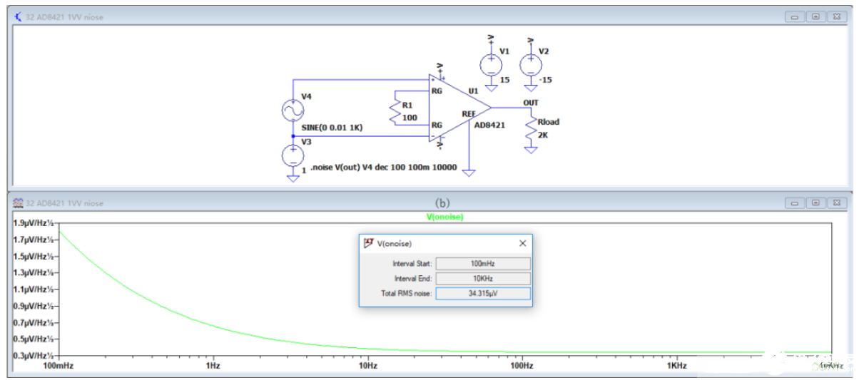 噪声分析结果如图3.15(b),AD8421总输出噪声为34.315μV,小于43.76μV。