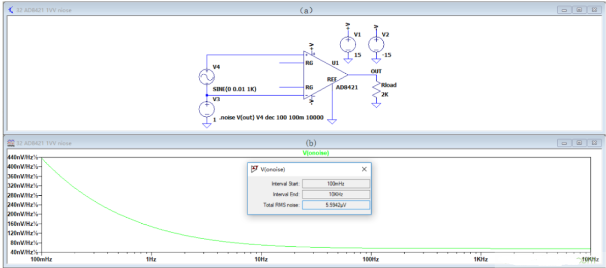 噪声分析结果如图3.14(b),AD8421的总输出噪声RMS值为5.59μV小于7.52μV。