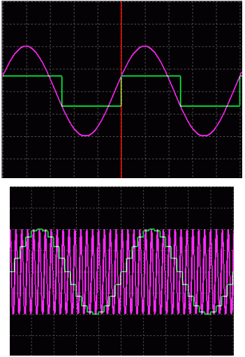 什么导致混叠?奈奎斯特准则解释了这种效应。该标准表示,如果将时间连续信号转换为时间离散信号,则每个周期需要采样两次以上。如果对信号的采样频率不够高,信息将不可避免地丢失。如果每个周期对信号采样一次,则会生成直流信号(具有任意幅度)(图 1);如果每个周期恰好采样两次,则会生成方波(图 2)。重要的是要注意以输入信号周期的两倍进行采样是一种非常特殊的情况,应始终避免。图 3 显示了以 200 kHz 采样的 190 kHz 信号。结果是一个完美的正弦波,但频率完全错误。这种频率变化是由混叠引起的。