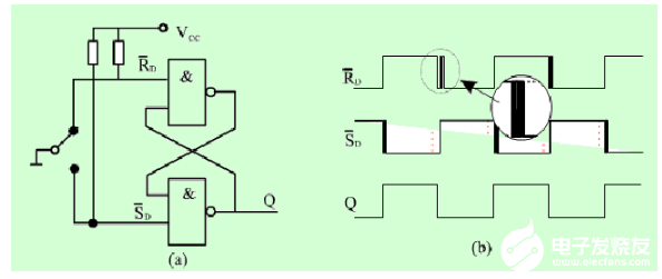 基本RS锁存器虽然电路相当简单,但有很广泛的使用,下图是在时序电路是广泛使用的消除抖动开关电路的使用的例子。