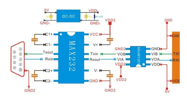 在RS232总线通信中,双通道数字式隔离器ADUM1201用来实现控制器和RS232收发器之间的电气隔离,以到达更好的抗干扰性能。一般放在微控制器和RS232收发器之间,以实现系统间的隔离。