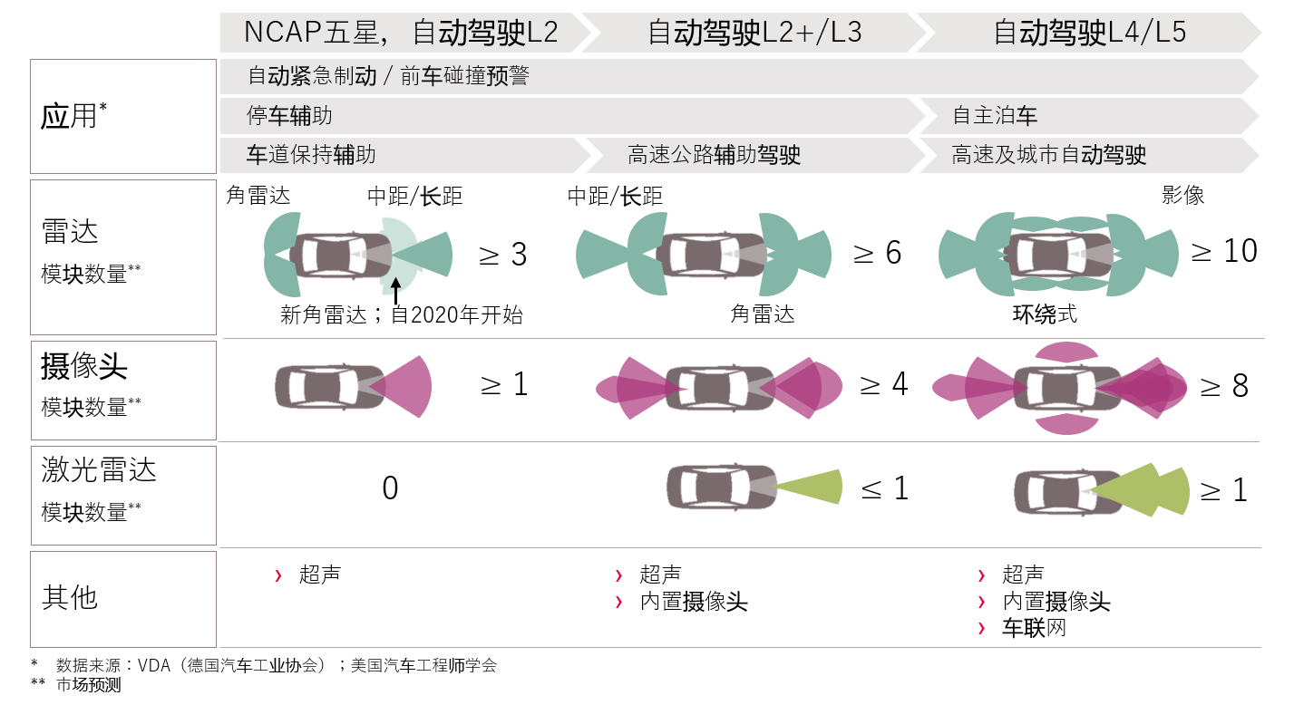 图4:随着自动驾驶程度的提高,需要的传感器数量会越来越多。