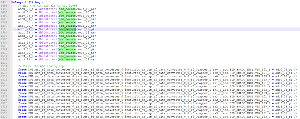 ADC 包含demo_tb_rfadc_data_source.sv,其中包含demo_tb_rfadc_tile_source.sv。在代码中,我们提供的是正弦查找表 (LUT)。在此情况下,将循环此 LUT 并生成正弦波输出。