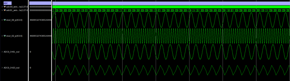 我在此处还附上了 AXI Stream 传输的 8 个采样之一的截屏,以显示 ADC 能正常转换单音信号。