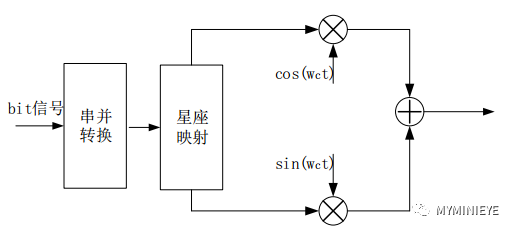 简单的讲,数字IQ调制的过程就是将原始比特流数据按照一定的规则映射到IQ坐标系的过程,IQ坐标系本质上就是复数坐标系,映射完成后将得到I和Q两路信号,然后相加得到要发射的射频信号,如下所示: