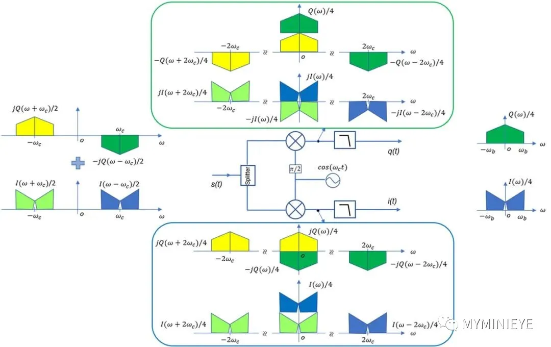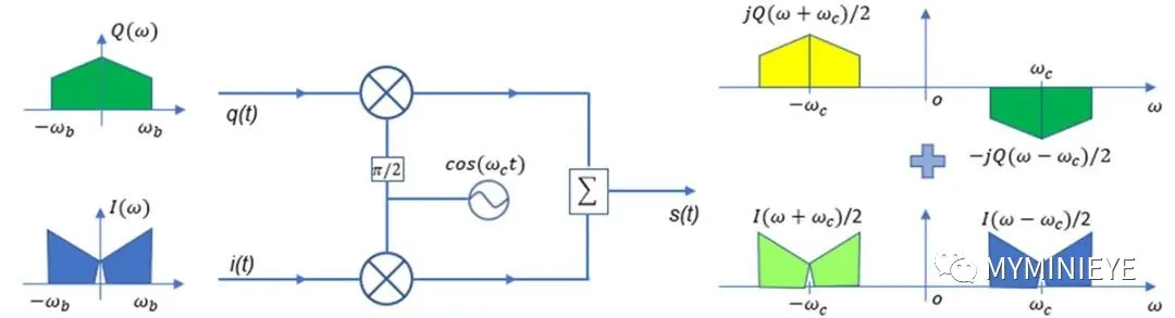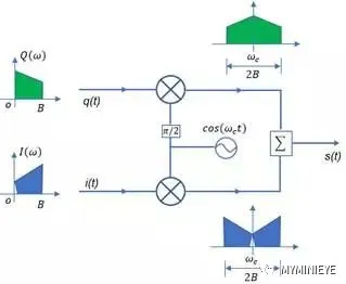 IQ调制属于双边谱,在上变频的过程中,两个Mixer实际上起到乘法器的作用,即i(t) 与cos(wct )相乘,q(t) 与sin(wct) 相乘,最后合为一路输出,假设I(w) 和Q(w) 分别为i(t) 和q(t) 的傅里叶变换,根据频域卷积定理可得